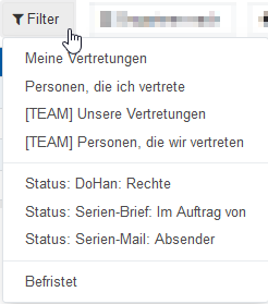 In der Übersicht erhalten Sie eine Auflistung aller Personen mit entprechendem Vertretungsrecht. Mit Klick auf das X-Symabol, kann der Filter entfernt werden und es werden Ihnen alle Vertretungsregelungen anzeigt (z.B. wen Sie vertreten dürfen).