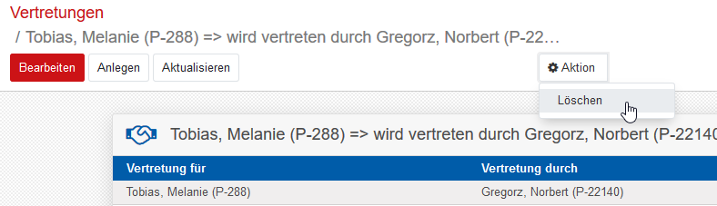 Um ein Vertretungsrecht wieder zu löschen, rufen Sie die entsprechende Vertretung auf, klicken auf “Aktion” und anschließend auf “Löschen”.