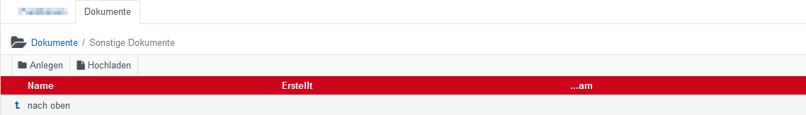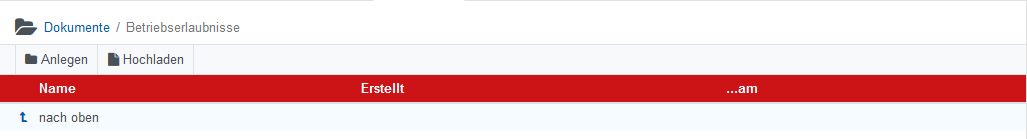 Um ein Dokument zu hinterlegen, wählen Sie den entsprechenden Ordner aus. Sie haben die Möglichkeit über “Anlegen” einen Unterordner zu definieren. Mit Klick auf “Hochladen” können Sie ein Dokument hinzufügen. Mit dem Pfeil nach oben gelangen Sie wieder eine Ordnerstruktur nach oben.