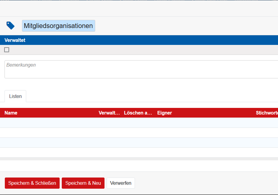 Vervollständigen Sie das Stichwort, hinterlegen Sie ggf. eine Bemerkung und klicken auf “Speichern & Schließen”. Mit Kick auf “Speichern & Neu” können Sie weitere Stichworte für diese Liste anlegen und gelangen immer wieder in Anlege-Maske der Stichworte.