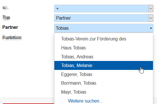Suchen Sie im Anschluss nach dem Namen oder der ETR-Nummer des*r Partner*in oder nach dem Namen des Gremiums. In der Schnell-Suche können Sie den Namen oder die ETR-Nummer anfangen zu tippen und erhalten direkt Vorschläge. Sie können auch die klassische Suche verwenden, indem Sie auf “Weitere suchen…” klicken.