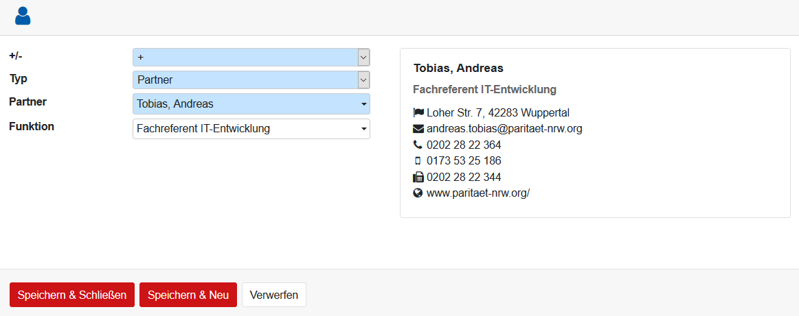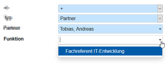 Möchten Sie eine*n Partner*in mit einer Funktion in die Liste übernehmen, so können Sie dies über das Feld “Funktion” auswählen. Hier werden Ihnen die entsprechenden Funktionen des*r Partners*in angezeigt.