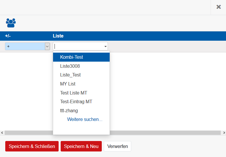 Um vorhandene Listen zu suchen, beginnen Sie den Namen der Liste zu schreiben. Es werden Ihnen alle Listen angezeigt, die Ihr Stichwort beinhalten. Mit Klick auf die entsprechende Liste übernehmen Sie diese. Über “Weiter Suchen” können Sie nicht nur nach dem Namen einer Liste suchen, sondern beispielsweise auch nach dem Eigner, Stichwort,… Mit dem Button “Speichern & Neu” können Sie weitere Listen hinzufügen oder abziehen, ohne diese Maske zu verlassen. Mit Klick auf “Speichern & Schließen” übernehmen Sie die Listen.
