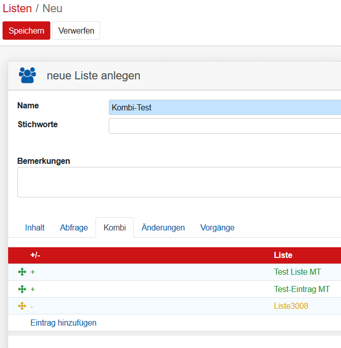 Um eine Kombi-Liste anzulegen, klicken Sie auf den Reiter “Kombi”