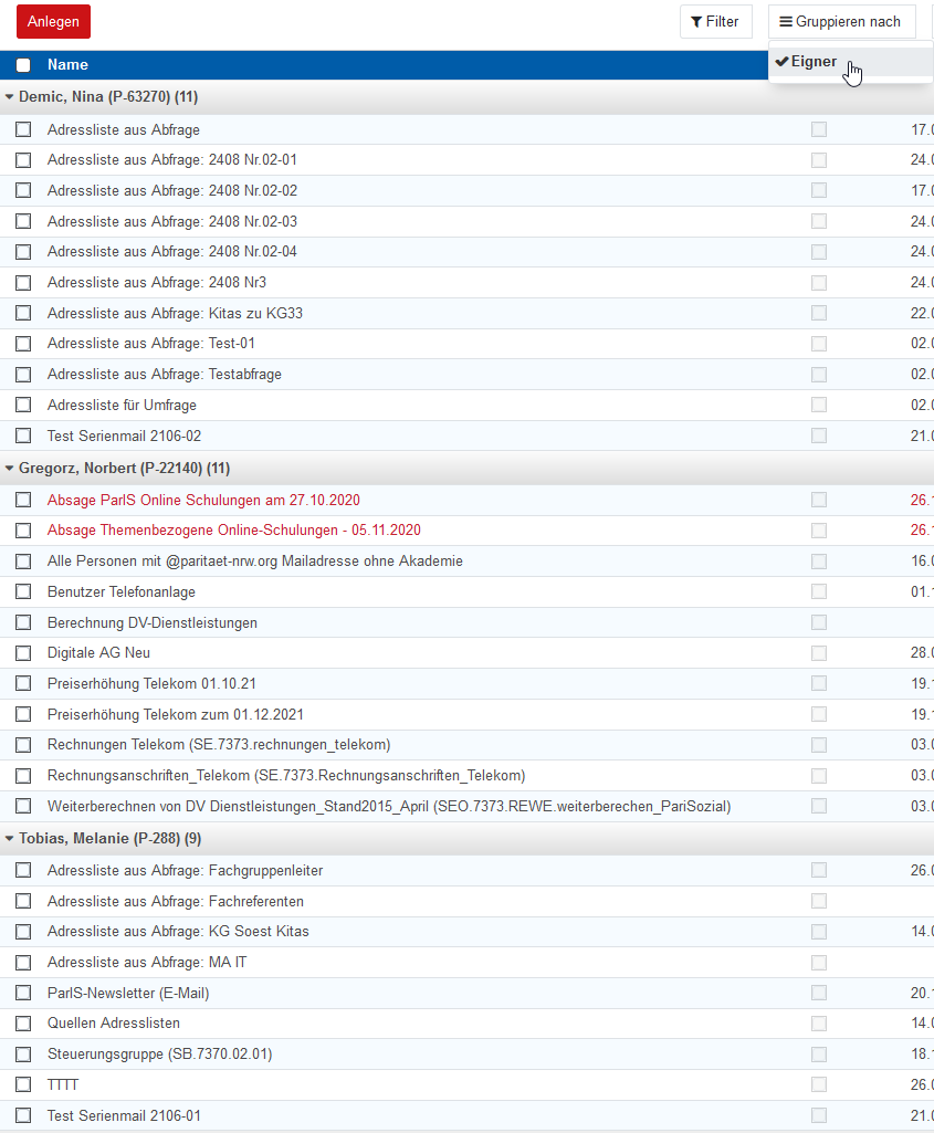 Im Anschluss kann die Auflistung noch Eigner*in gruppiert werden. So können Sie sehen, welche Liste zu Ihrem Teammitglied gehört.
