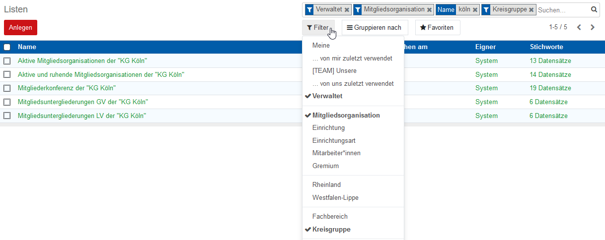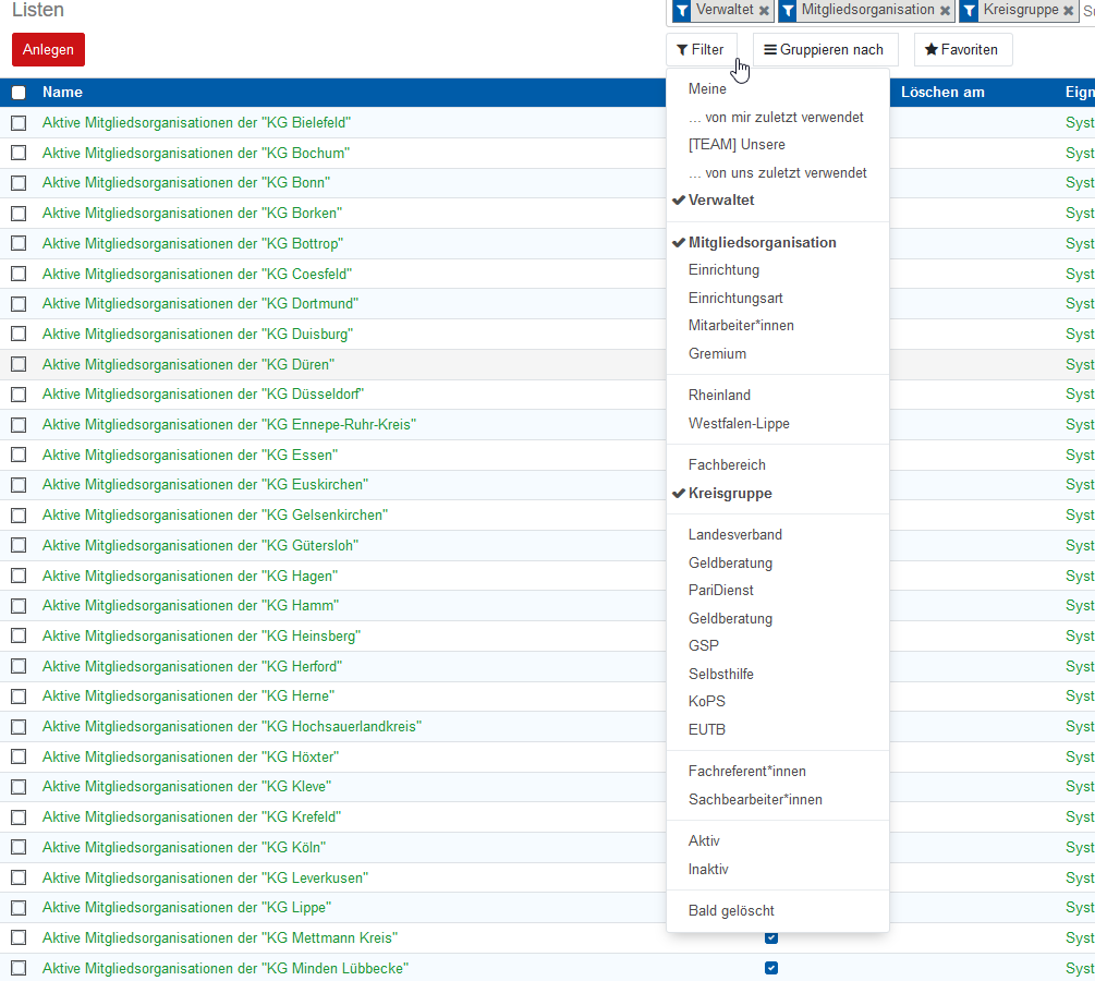 Z.B. können Sie sich “Verwaltete” Listen (verwaltet = Liste, welche von der Programmierung erstellt wurden und immer aktuell sind) mit Mitgliedsorganisationen und Kreisgruppen anzeigen lassen.