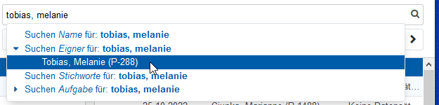 Hierzu tragen Sie den Namen in das Suchfenster ein, klicken auf den Pfeil vor Suche Eigner für: tobias, melanie und wählen anschließend “Tobias, Melanie (P-288)” aus.