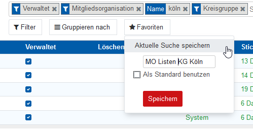 Hierzu wählen Sie bei dem Filter “verwaltet”, “Mitgliedsorganisation” und “Kreisgruppe” aus und tragen in dem Suchfenster “köln” ein und suchen nach dem Namen.