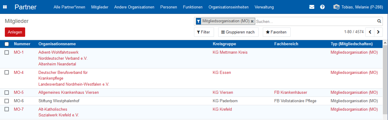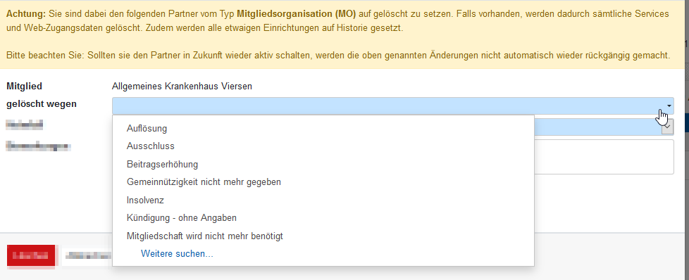 Gelöschte Mitgliedsorganisationen (MO) werden unter dem Menüpunkt “Partner” im Untermenü “Mitglieder” rot dargestellt.
