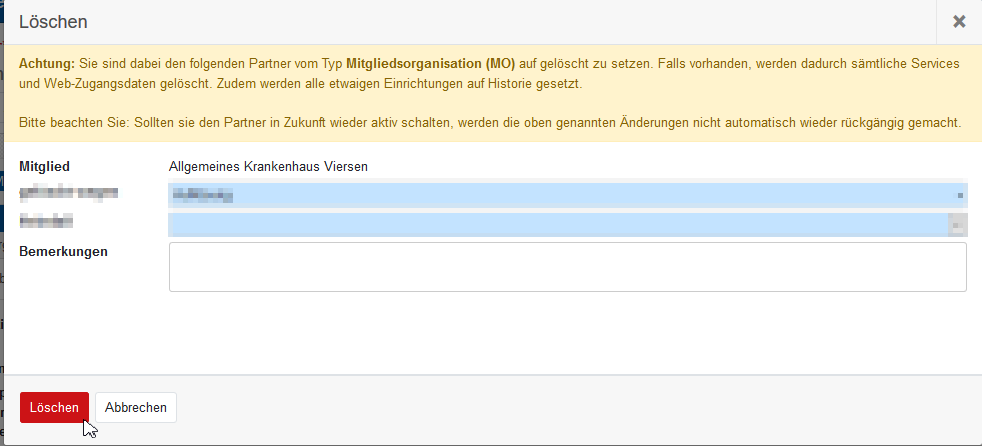 Sie erhalten einen Hinweis, dass Sie dabei sind, eine Mitgliedsorganisation (MO) zu löschen und dass damit sämtliche Services und Web-Zugangsdaten gelöscht werden.