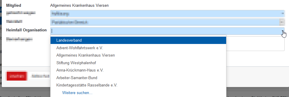 Nachdem Sie einen Heimfall ausgewählt haben, wählen Sie zusätzlich die Heimfall Organisation aus. In der Schnell-Suche können Sie den Namen der Organisation anfangen zu tippen und erhalten direkt Vorschläge. Sie können auch die klassische Suche verwenden indem Sie auf “Weitere suchen…” klicken.