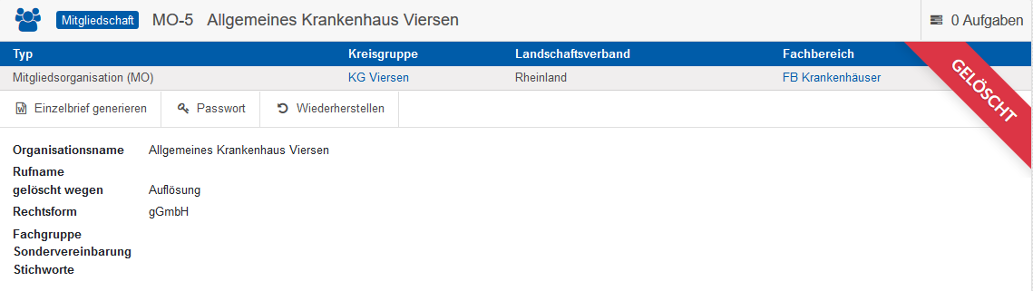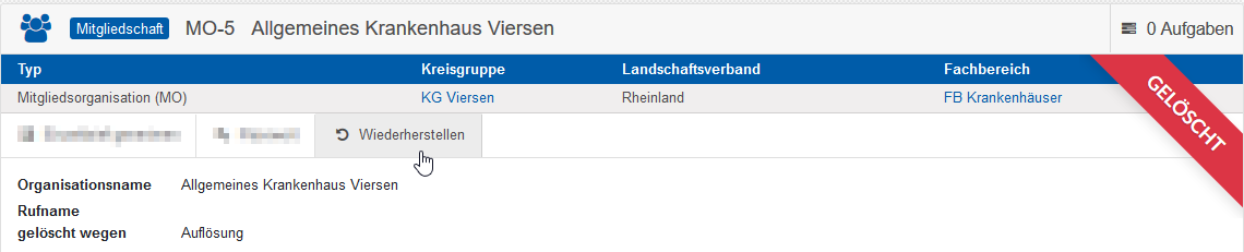 Gelöschte Mitgliedsorganisationen (MO) können wieder hergestellt werden.