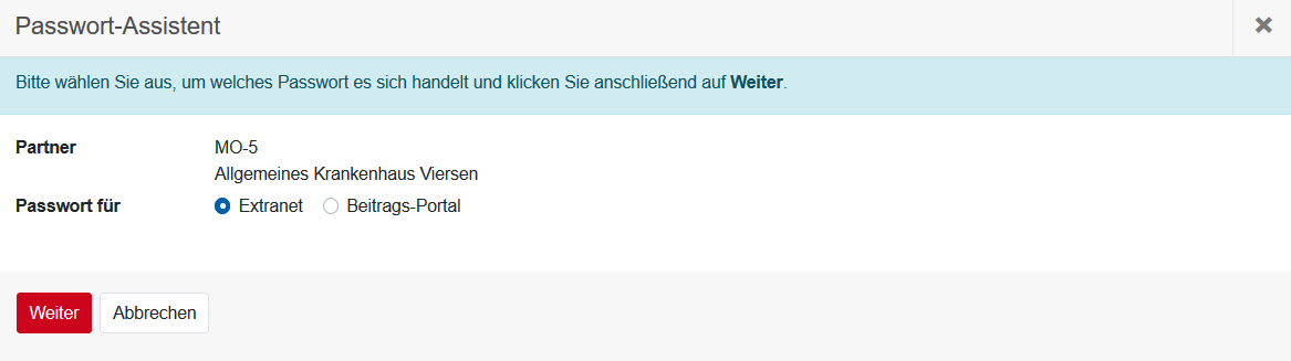 Wählen Sie aus, ob es sich um das Extranet Passwort handelt oder um das Passwort für das Beitrags-Portal.