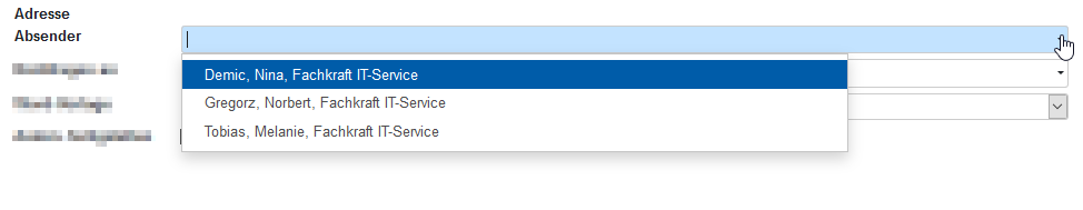 Wählen Sie die Absenderadresse aus. Das können sowohl Sie selbst, aber auch Personen, die Ihre Vertretungsrechte haben, sein.