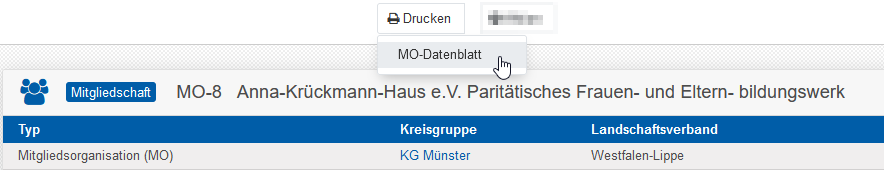 Um von einer Mitgliedsorganisation (MO) ein Datenblatt zu generieren, rufen Sie die entsprechende Mitgliedsorganisation auf und lassen Sie sich die Stammdaten anzeigen.