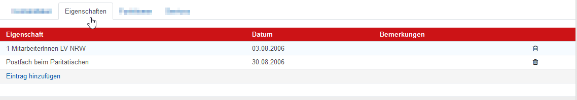 Der Reiter “Eigenschaften” zeigt die hinterlegten Eigenschaften der Organisation an und Sie können hier weitere Eigenschaften hinterlegen.