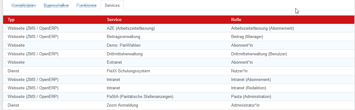 Über den Reiter “Services” können Sie einsehen, welche Rechte die Organisation auf unseren Seiten hat.