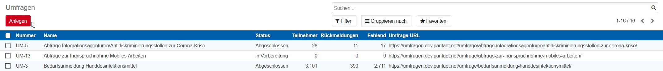 Sie erhalten eine Übersicht aller bereits hinterlegten Umfragen. Klicken Sie auf “Anlegen” um eine neue Umfragen zu hinterlegen.