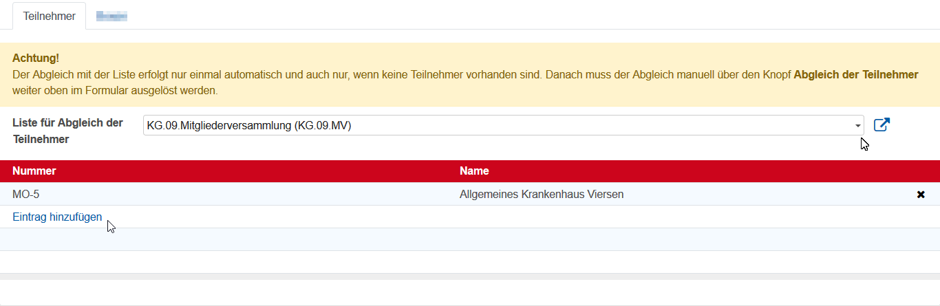 Über den Reiter “Teilnehmer” wählen Sie eine vorhandene Liste aus. Sie können weitere Mitgliedsorganisationen über “Eintrag hinzufügen” mit in die Umfrage aufnehmen.