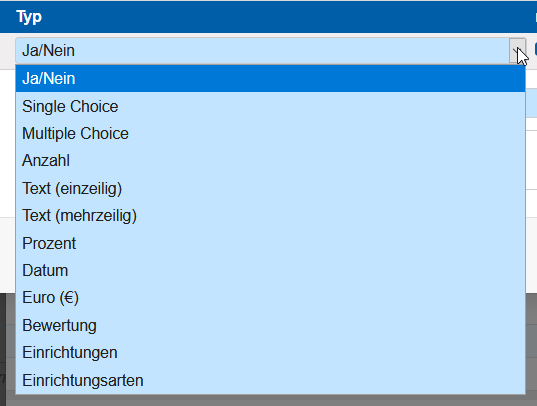 Beim Auswahlfeld “Typ” können Sie die Art der Frage auswählen: