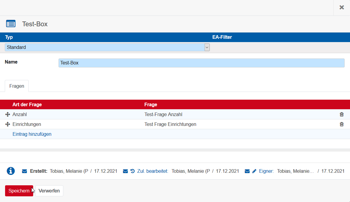 Sie können mehrere Boxen (Abschnitte) und die dazugehörigen Fragen hinterlegen. Nachdem Sie Ihre Fragen hinterlegt haben, klicken Sie auf “Speichern”.